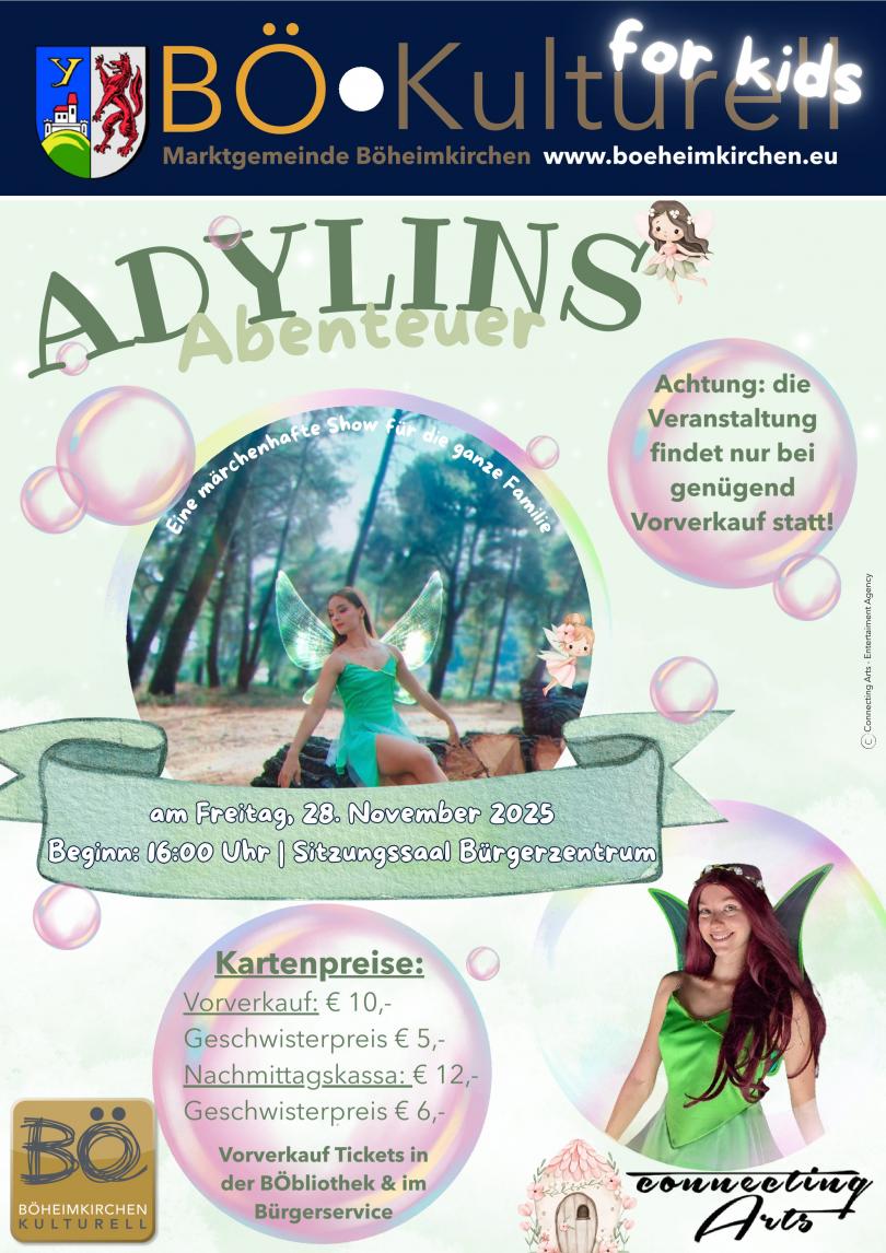 Die einzigartige Show für Kinder und Familien. Die von Connecting Arts kreierte Show über die Waldelfe Adylin begeistert Groß und Klein, die Elfe reist durch verschiedene Welten und trifft besondere Wesen, Kreaturen und schließt viele Freundschaften. Eine lustige, spannende und mitreißende Show.